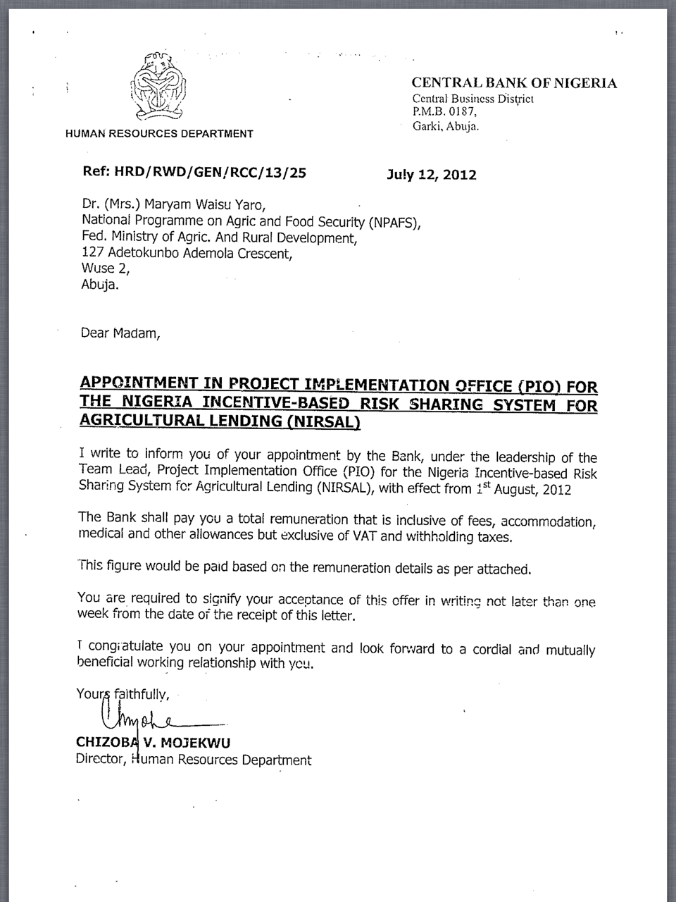 - i. Dr. Maryam Yaro is not, and has never been an employee of the Central Bank of Nigeria. She was one of four consultants (three of whom were male), hired by the Nigeria Incentive-based Risk-sharing System for Agricultural Lending (NIRSAL) Plc; on a one year contract, renewable on the basis of satisfactory performance. NIRSAL Plc is a special purpose vehicle (SPV) set up by the Federal Government of Nigeria, through a partnership between the CBN and the Federal Ministry of Agriculture and Rural Development (FMARD).